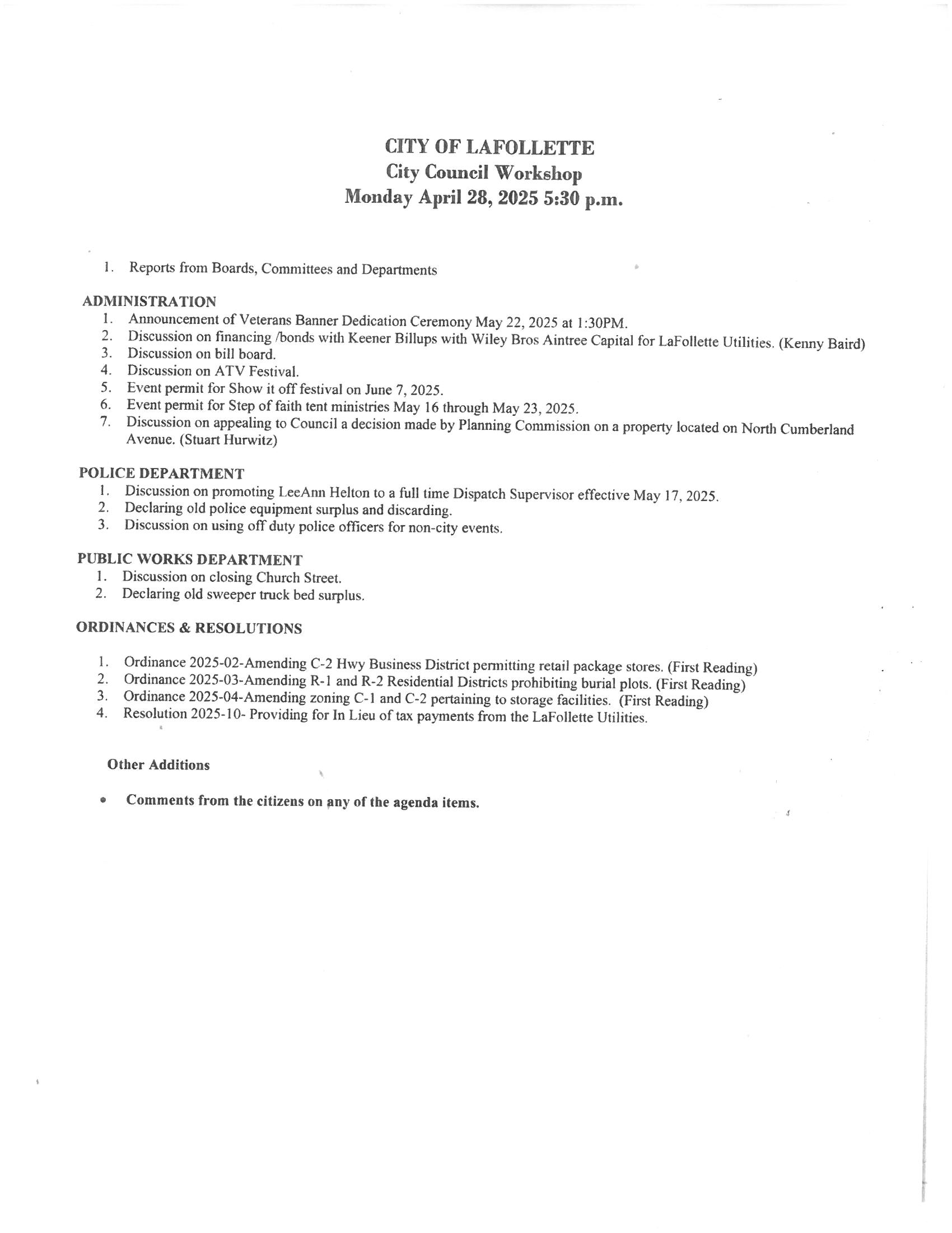 CITY OF LAFOLLETTE WORKSHOPS ARE HELD THE LAST MONDAY OF EACH MONTH AT 5:30 IN THE COUNCIL ROOM AT207 S TENNESSEE AVE LAFOLLETTE, TN 37766. FOR MORE INFORMATION CALL 423-562-4961