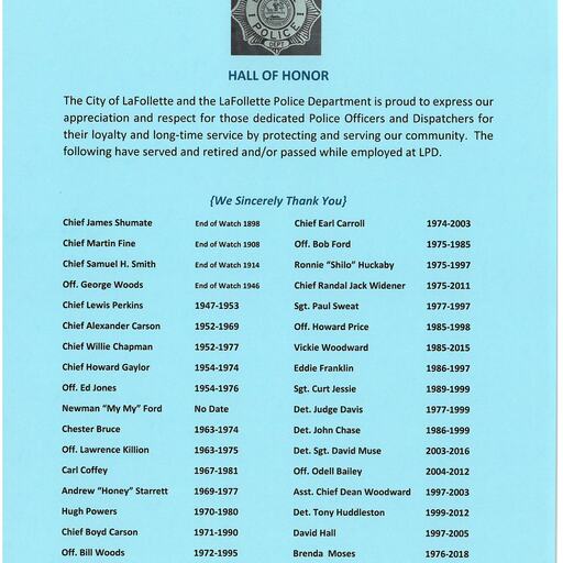 Chaplains involved in this program are on-call for the LaFollette Police Department 24 hours a day/seven days a week. The LPD Chaplain's Corp is a support service for employees and their families as well as the community during crisis situations. Chaplains assist officers or other departmental personnel and their families for needs like marriage counseling, family support, during times of illness, stress, or grief. Spiritual support and assistance to the community is provided during crisis concerns. Our Chaplains respond to calls of death, major accidents, or when other community/police needs arise. The Chaplains program is considered a core function for the LaFollette Police Department.