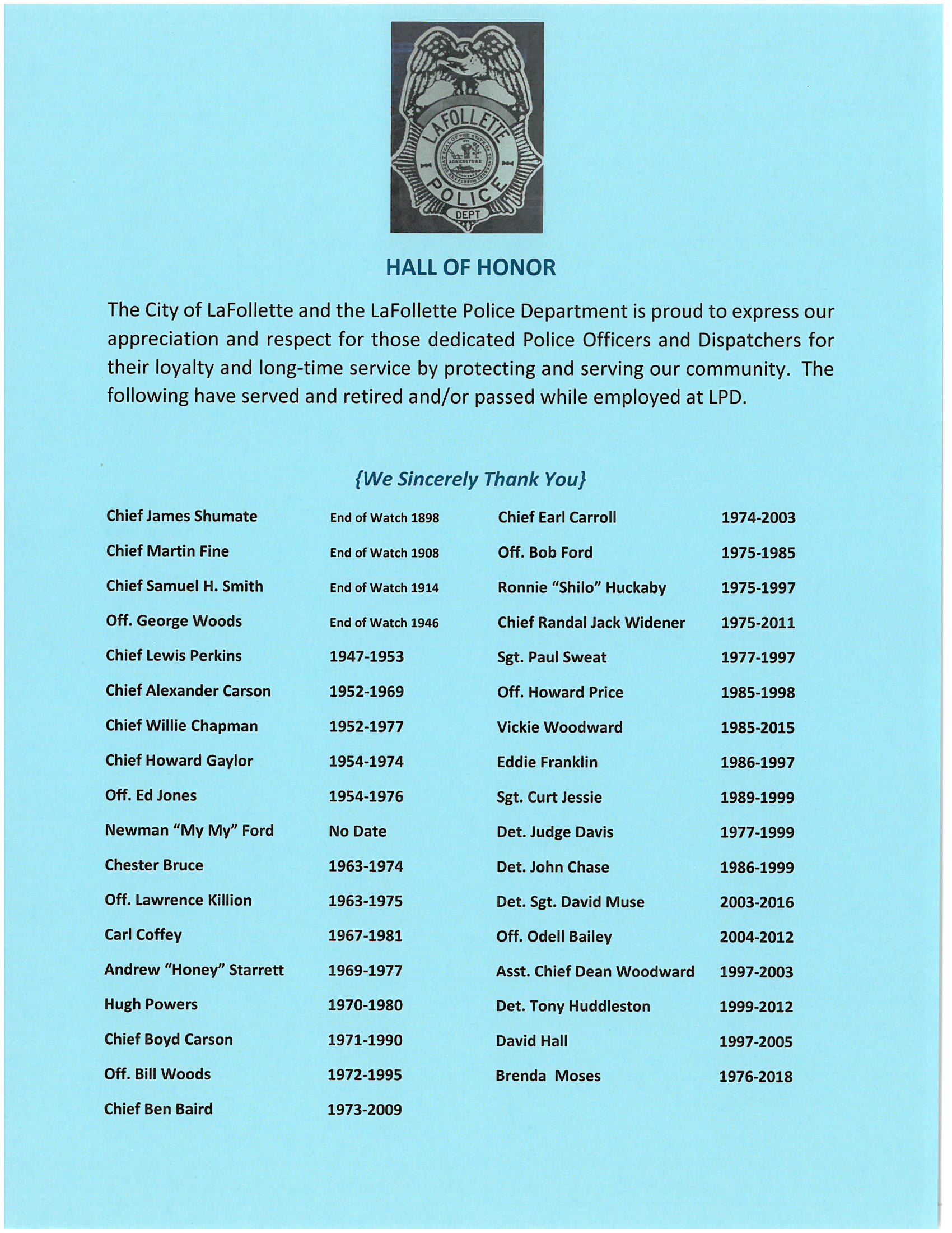 As custodians of the public welfare, we accept responsibility of the delivery of such services that will promote the well being and improve the quality of life of all within our community. This mission requires we be active participants, not idle spectators in the progress and development of our department and community. The LaFollette Police Department has freely and openly accepted the challenges and responsibilities of this mission. We will execute our duties in a lawful, just, and humane fashion in pursuit of a successful completion of our mission.