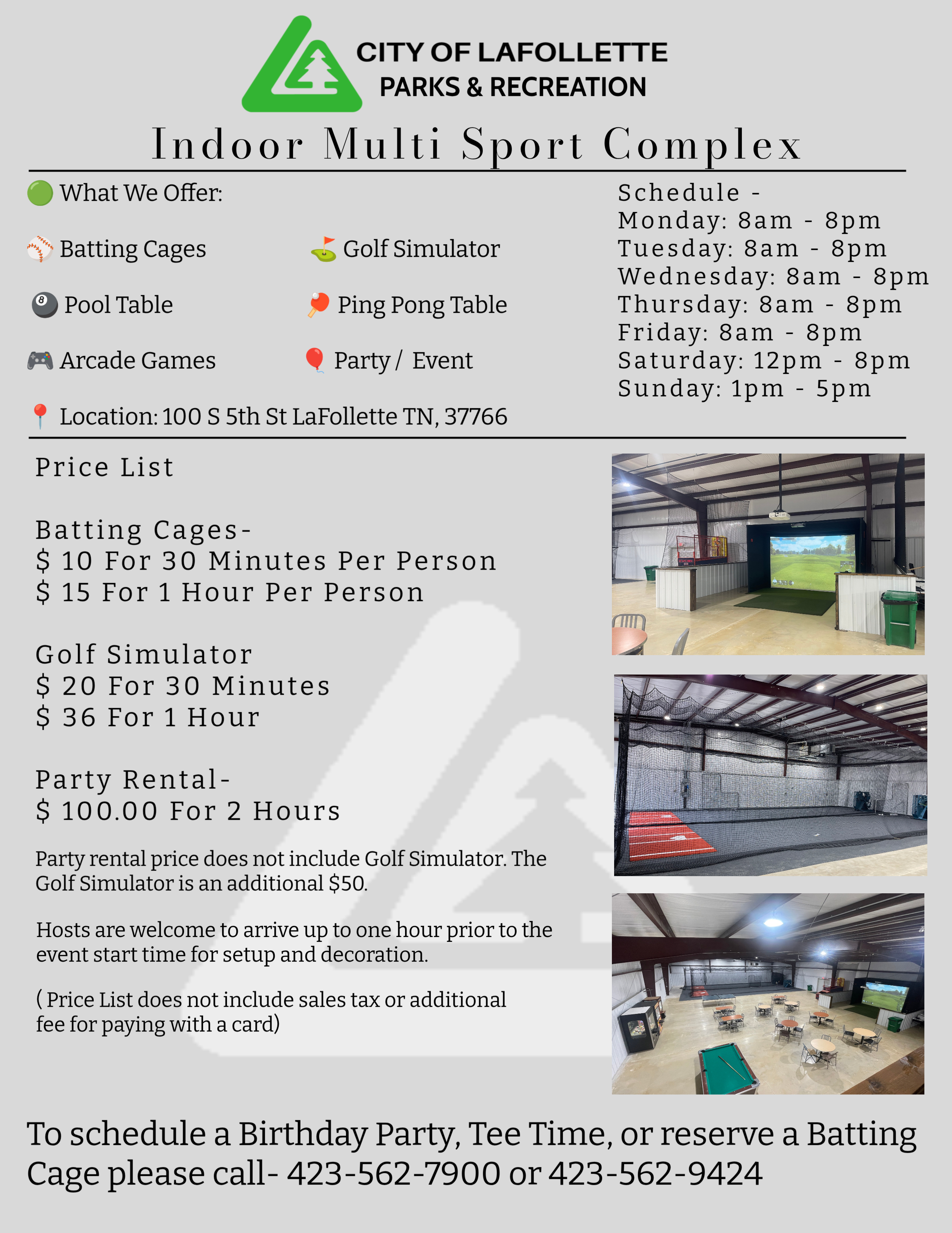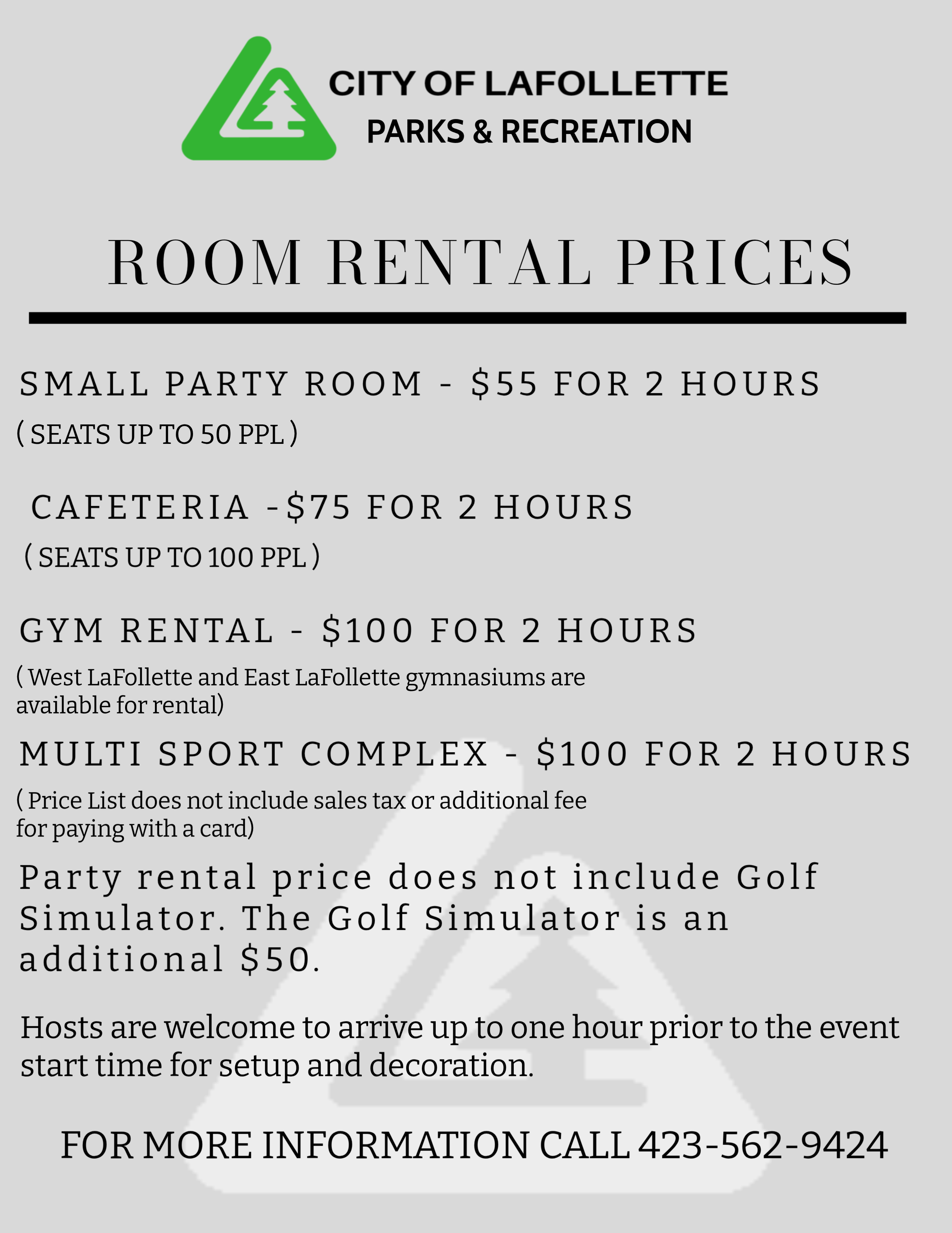 FOR ROOM RENTAL INFORMATION, PLEASE CONTACT THE LAFOLLETTE RECREATION CENTER AT (423) 562-9424 or fill out the form below.
